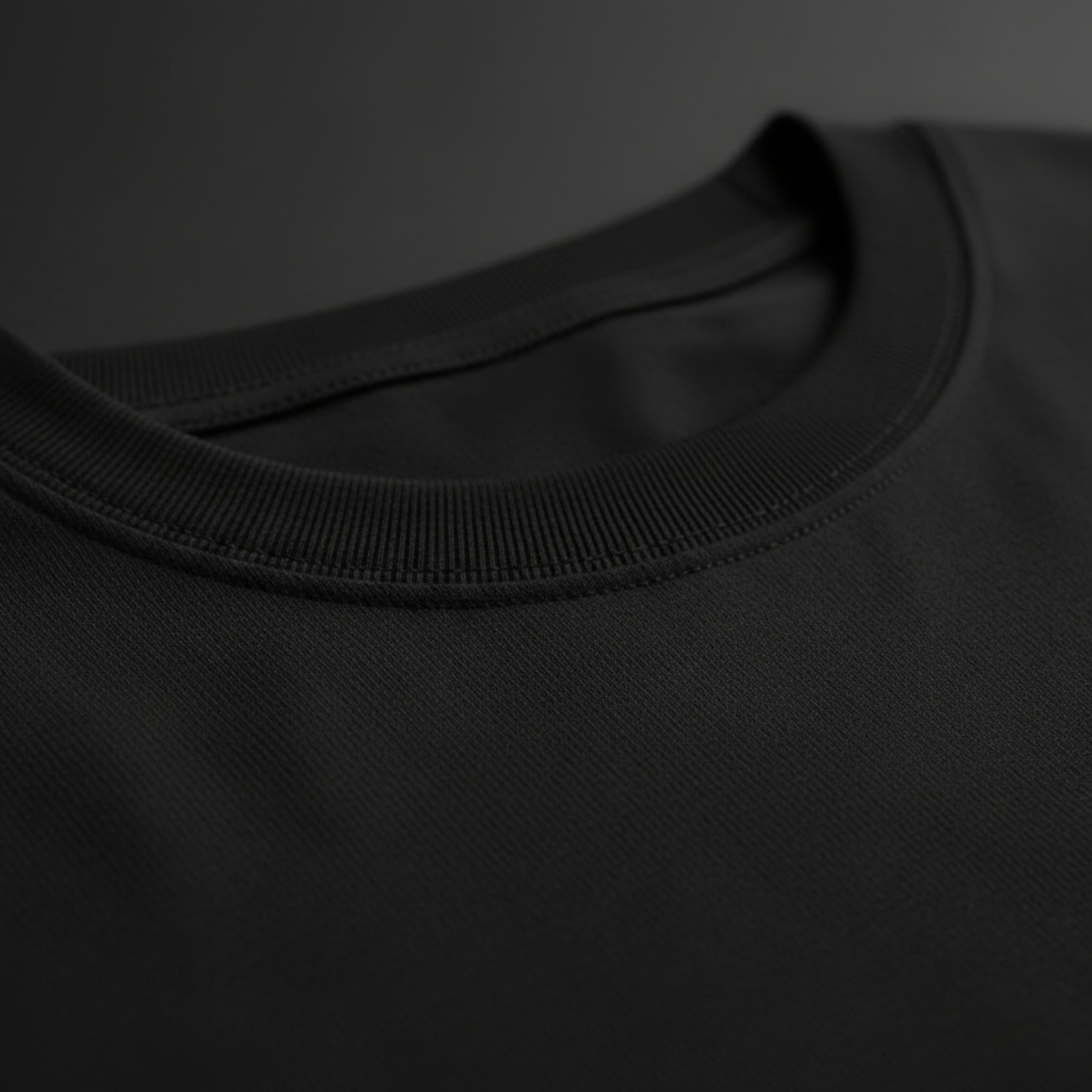 This macro shot emphasizes the thick, resilient rib collar designed to maintain its shape wash after wash. The 240 GSM fabric's substantial surface texture is evident, showcasing the structured material that ensures a perfect, non-flimsy drape. It’s a detail shot that proves the durability and quality of our core oversized tee